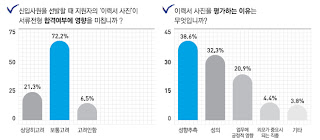 “왜 이력서 사진를 평가하느냐”의 추가 질문에 인사담당자 38.6%가 “지원자의 성격이나 성향을 추측할 수 있기 때문”이라고 답했으며, 뒤이어 32.3%가 “지원자의 성의를 평가하기 위함”이라고 대답했다. 또, 20.9%는 “준수한 외모와 인상이 업무에 긍정적인 영향을 미치기 때문”이라고 답해 이력서 사진이 서류전형 합격 여부에 크게 관여한다는 것을 알 수 있었다.