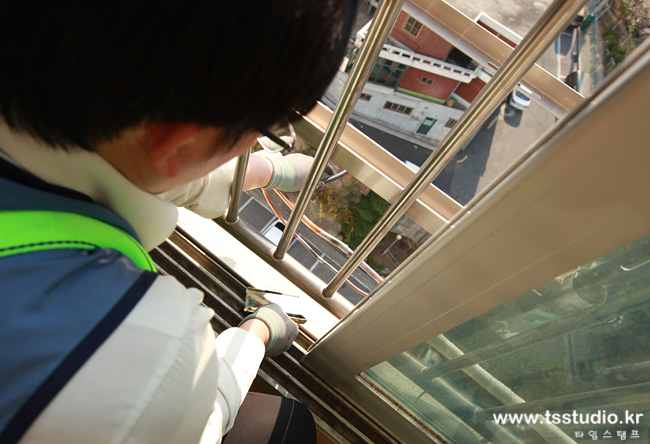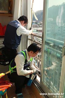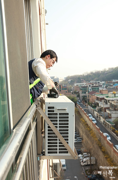 생각보다 실외기를 밖으로 빼는 작업이 위험해서 안전고리를 하고 작업을 하신다고 하더군요.